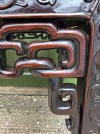 Impressive carved ‘huali’ hardwood centre table , with traditional carved motifs and carved and pierced open-work fret friezes of ‘endless-knot’ design. The top with a highly figured inset rouge marble ‘floating’ panel. Raised on shaped carved supports with carved claw feet.