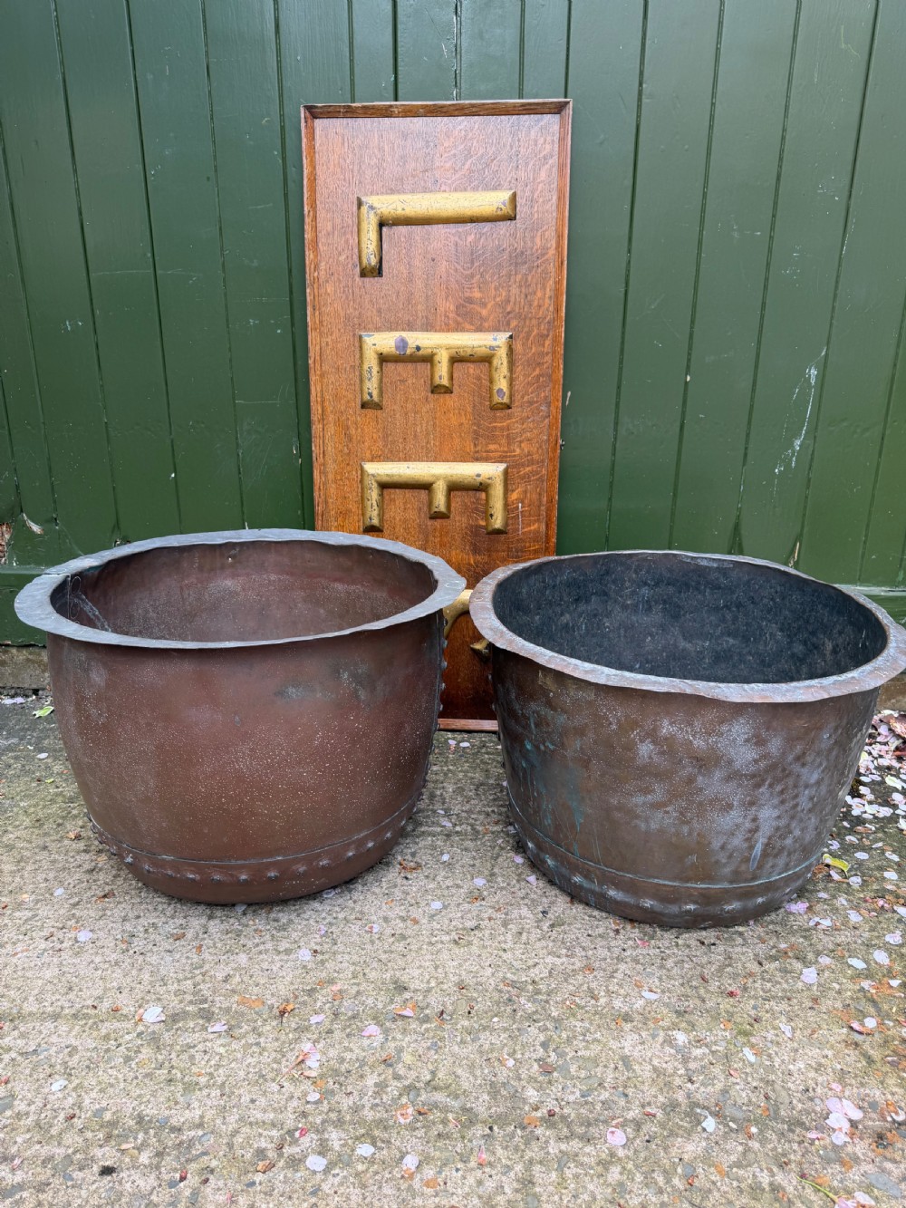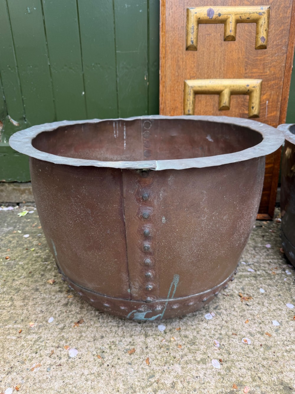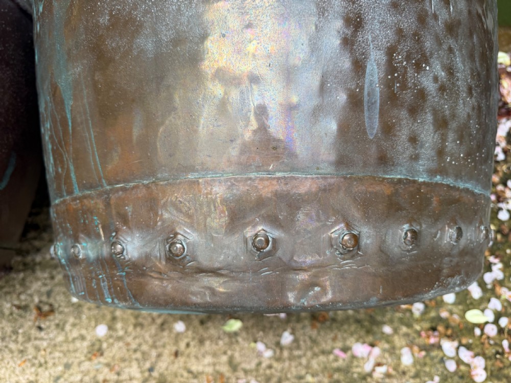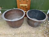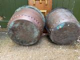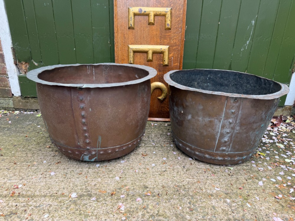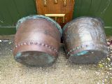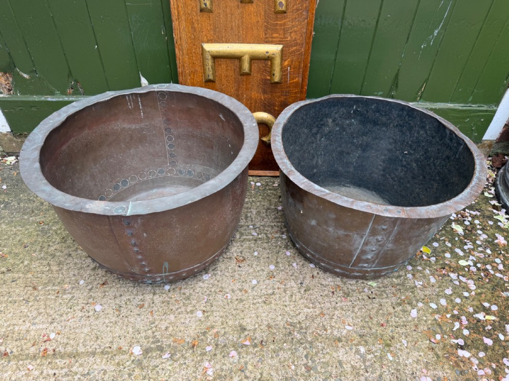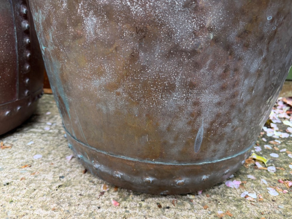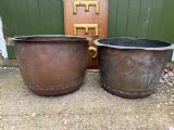 A characterful matched pair of coppers of larger scale, ideal for use as log-bins or planters to add symmetry to an interior or exterior scheme.