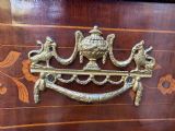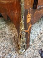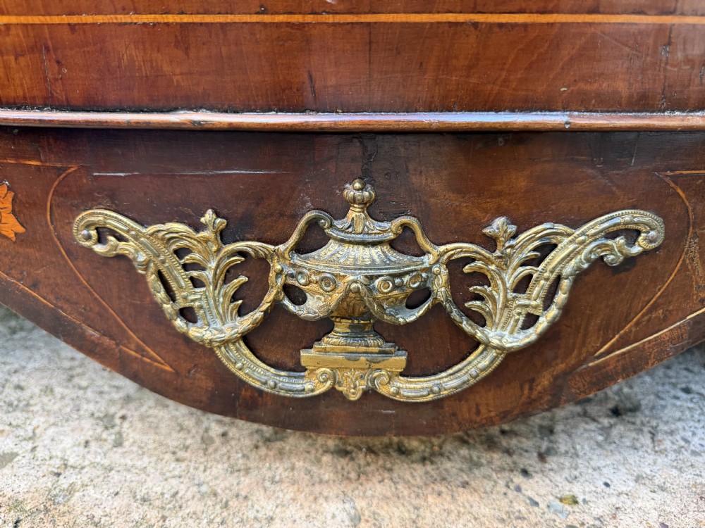 Fitted with a shaped interior with an arrangement of drawers ,a tambour centre door , secret and concealed drawers , and pigeon-holes all with corresponding floral marquetry inlay . The pull-out writing surface with it’s original oval gilt-tooled Moroccan leather-inset writing panel, above a 3-drawer , oak-lined , bombe shaped base . Neo-classical design gilded handles, escutcheons and mounts ,with sabots to the feet.