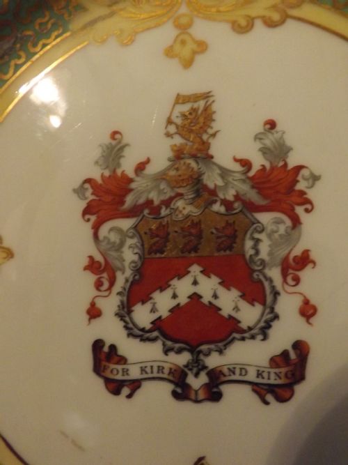 Pair early C20th Royal Cauldon porcelain armorial cabinet plates .Apple green border .Bears motto "For Kirk and King".Dia 9"