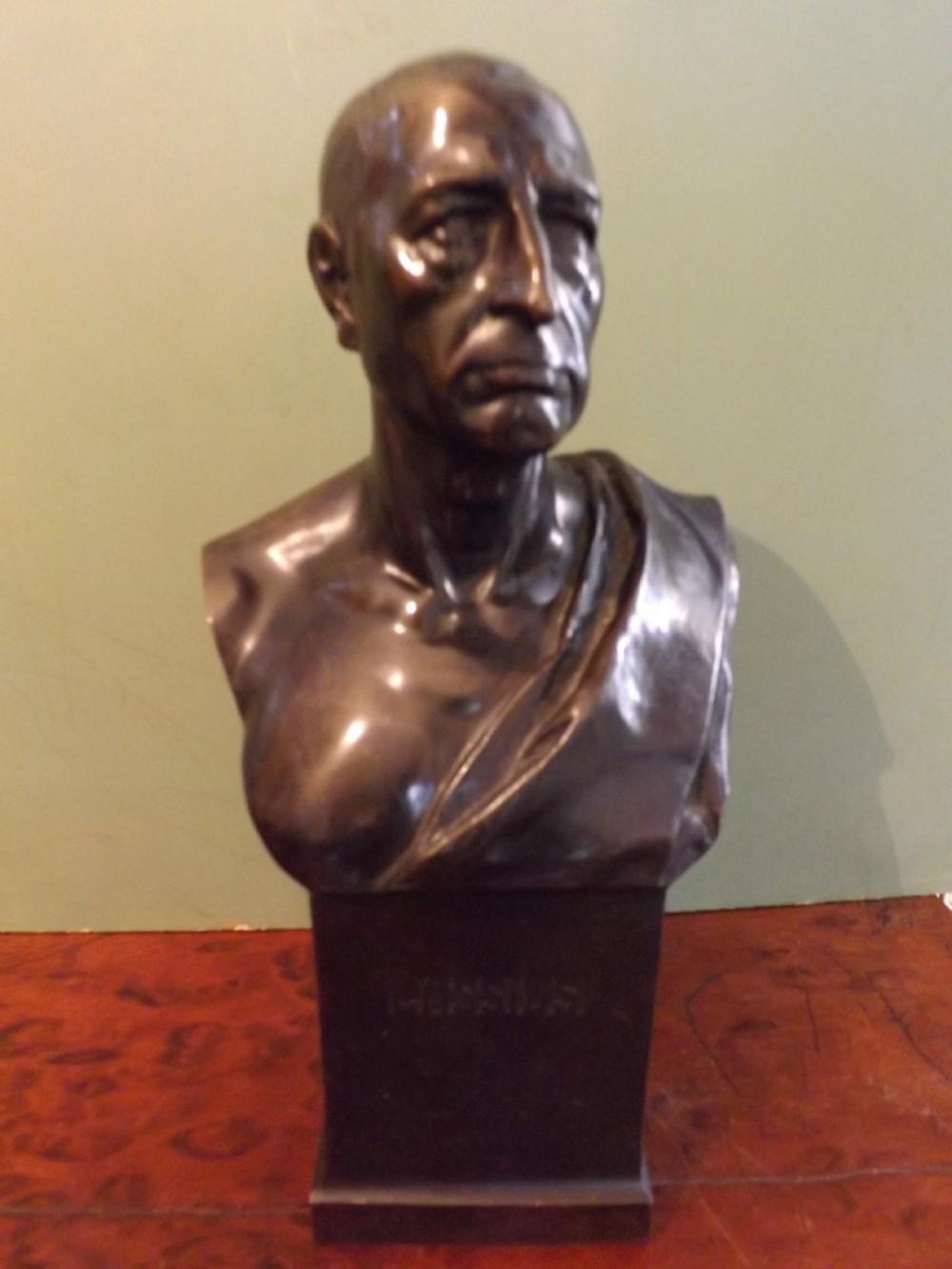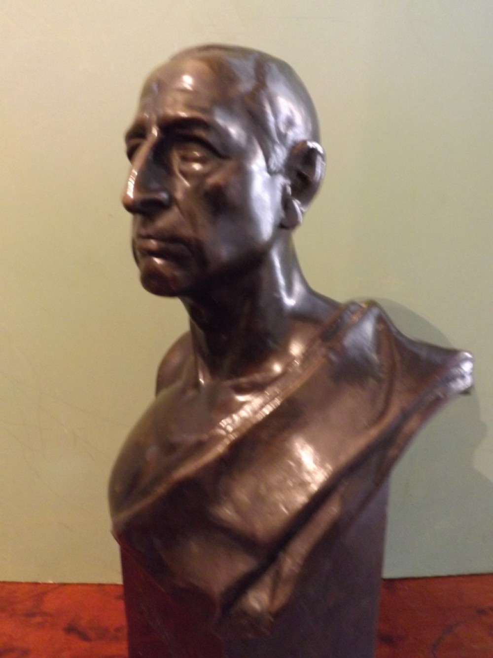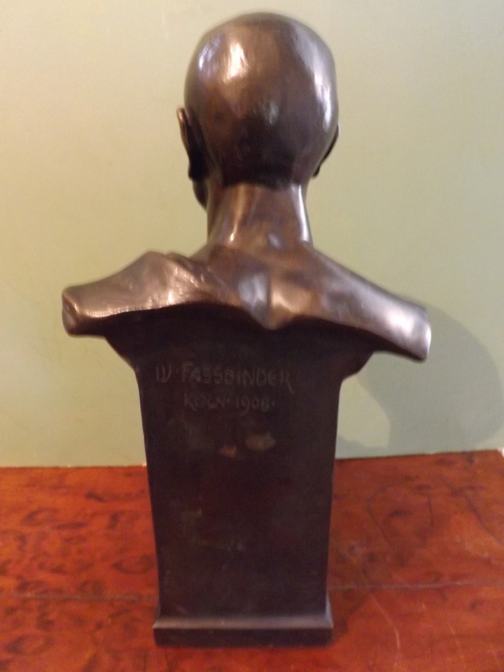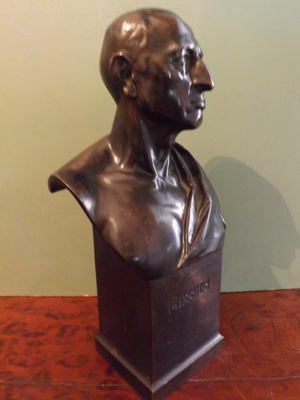 Early C20th bronze bust of Cassius. Signed and dated bronze study of the Roman General, philosopher and senator Gaius Cassius Longinus (85 BC-42 BC ) .Cassius was a leading instigator in the plot to assassinate Julius Caesar in an act of tyrannicide on 'The Ides of March' 44 BC ,and later led a rebellion in an attempt to seize power with Brutus .He died at the hands of his 'freedman' Pindarus, whom he ordered to kill him when he perceived his rebellious plot to grab control of The Empire and proclaim himself 'Imperator' had failed , and he was buried at Thasos . Inscribed to front "CASSIUS" and to rear "W. Fassbinder ,Koln 1908". Good patination . Powerful head and shoulders study with draped toga, head faced to 'sinister'(ie. looking to his left) raised on square block base .In Shakespeare's 'Julius Caesar', Cassius is described as follows " Yon Cassius has a lean and hungry look; He thinks too much, such men are dangerous". A expression that the sculptor has captured in this strong image . H 12.5". Cologne, Germany 1908.