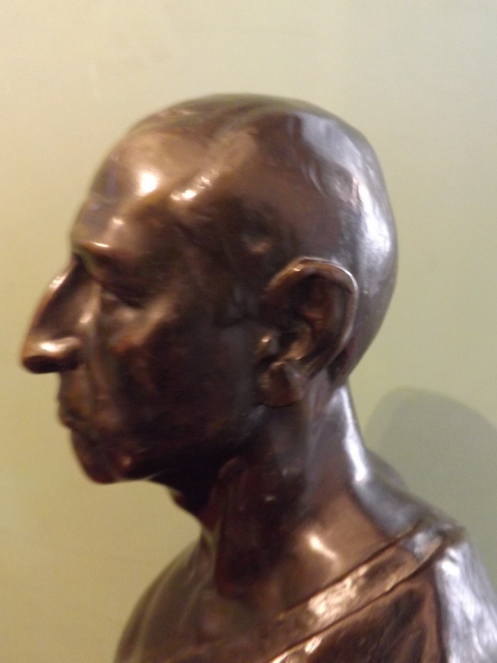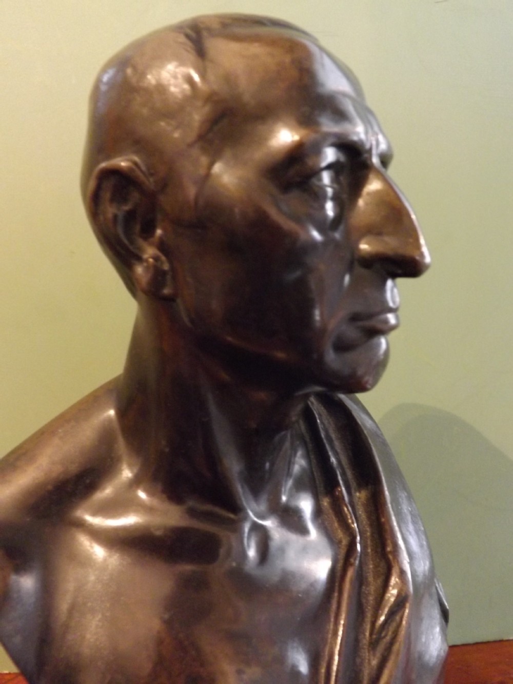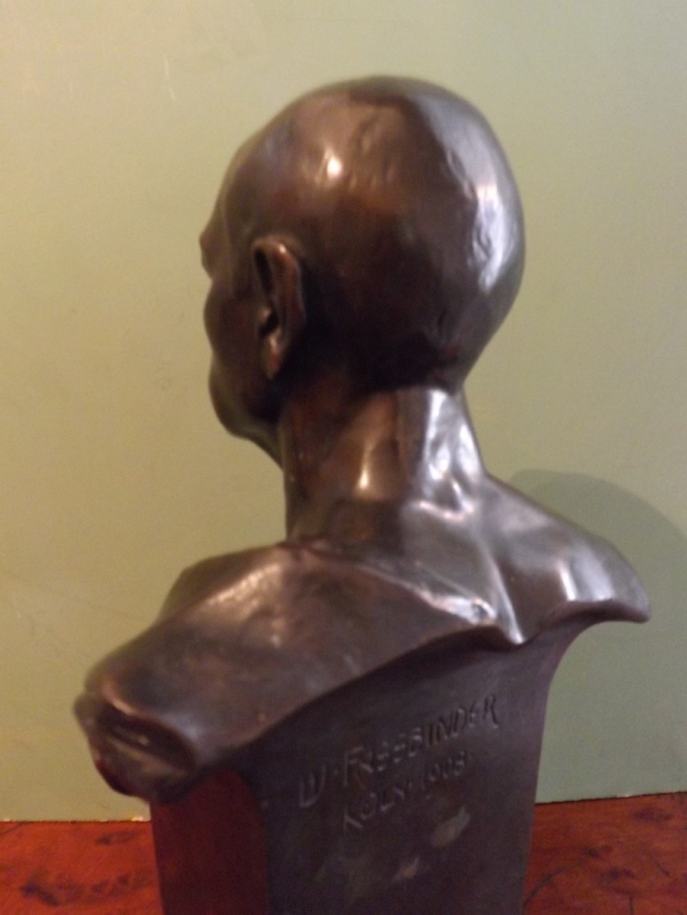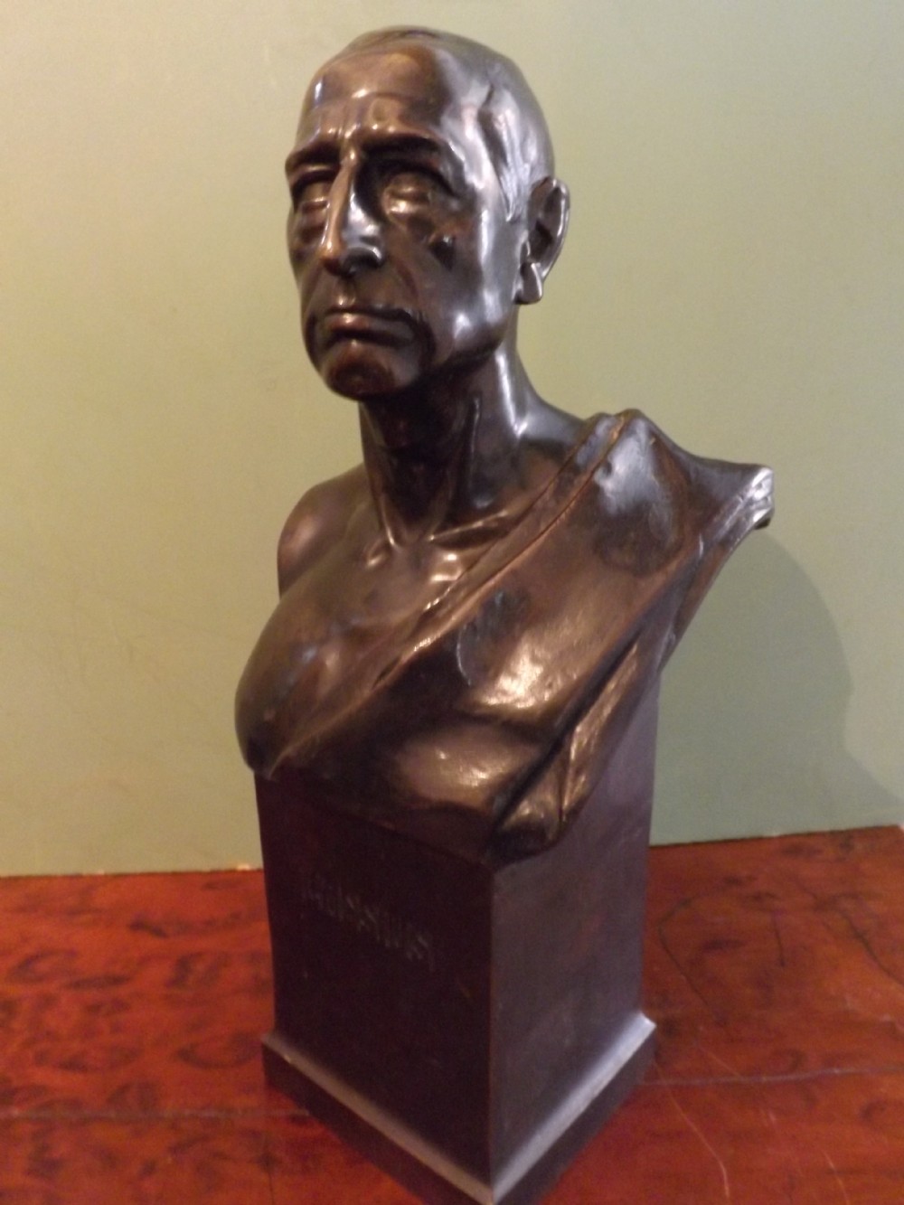Early C20th bronze bust of Cassius. Signed and dated bronze study of the Roman General, philosopher and senator Gaius Cassius Longinus (85 BC-42 BC ) .Cassius was a leading instigator in the plot to assassinate Julius Caesar in an act of tyrannicide on 'The Ides of March' 44 BC ,and later led a rebellion in an attempt to seize power with Brutus .He died at the hands of his 'freedman' Pindarus, whom he ordered to kill him when he perceived his rebellious plot to grab control of The Empire and proclaim himself 'Imperator' had failed , and he was buried at Thasos . Inscribed to front "CASSIUS" and to rear "W. Fassbinder ,Koln 1908". Good patination . Powerful head and shoulders study with draped toga, head faced to 'sinister'(ie. looking to his left) raised on square block base .In Shakespeare's 'Julius Caesar', Cassius is described as follows " Yon Cassius has a lean and hungry look; He thinks too much, such men are dangerous". A expression that the sculptor has captured in this strong image . H 12.5". Cologne, Germany 1908.