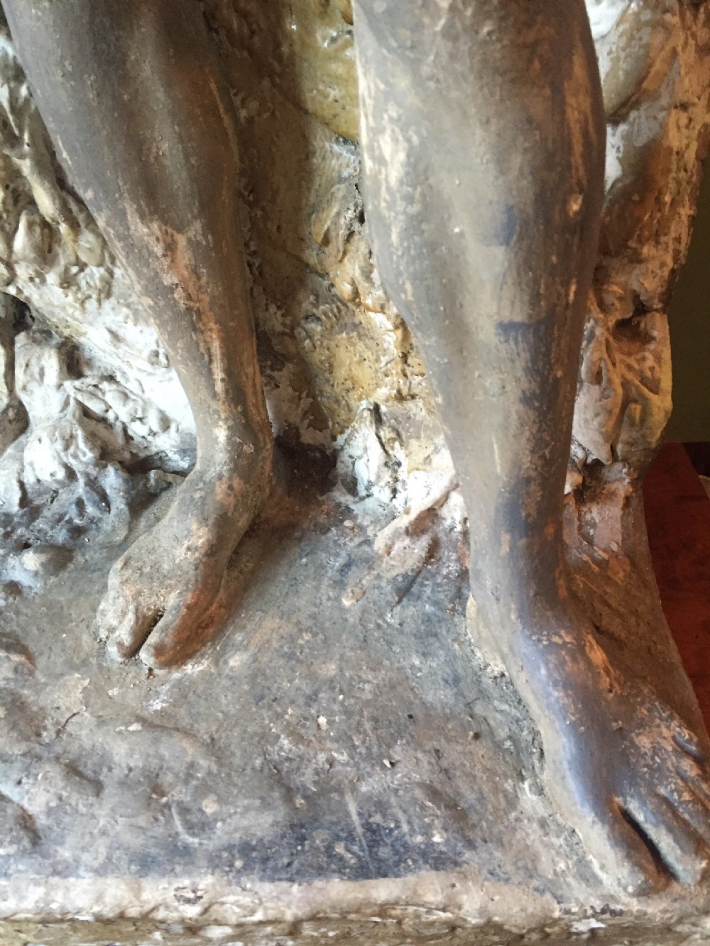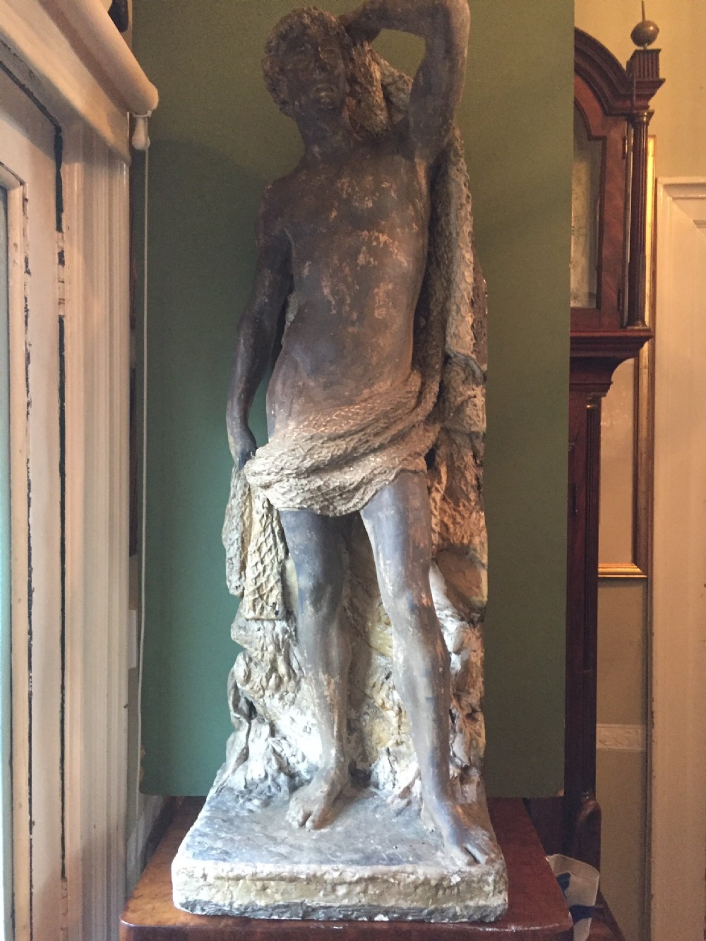 C19th 'Country-house' cast plaster classical figure. Interesting plaster figure of classical male subject depicted nude in contrapposto pose with raised arm , the torso wrapped in a fishing net . The figure stands upon a naturalistically modelled base against a rocky outcrop background . Of good scale with a worn grey paint finish in imitation of lead , some minor old repairs .