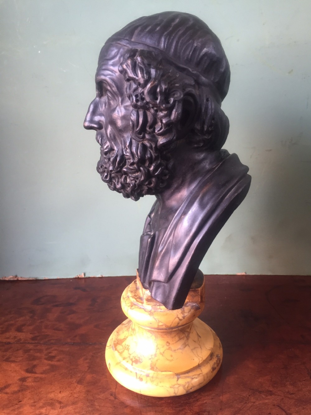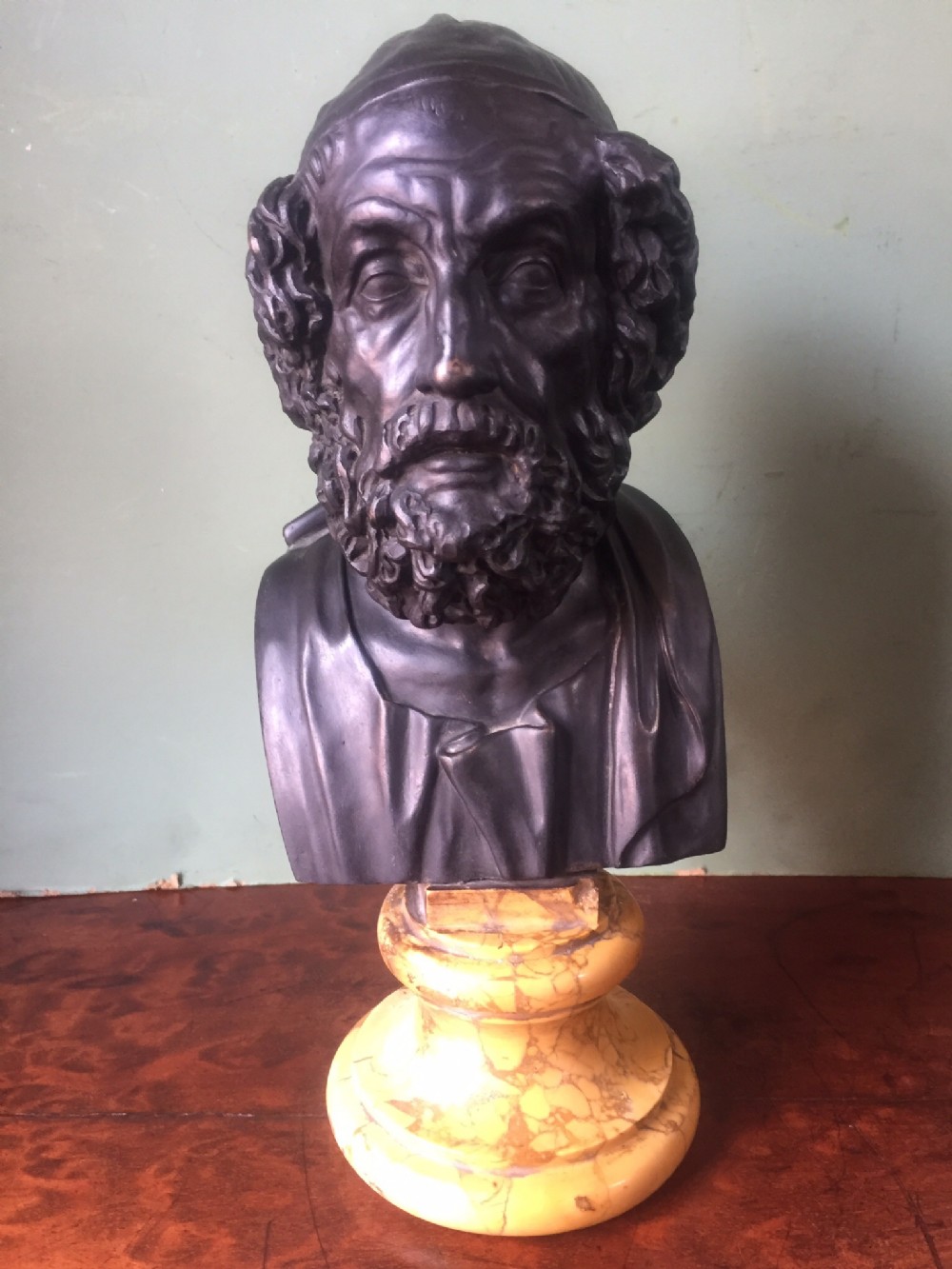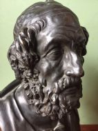 The British Museum has a marble bust dating to the Hellenistic period , portraying an idealised portrayal of Homer and a study upon which this bronze version is based.