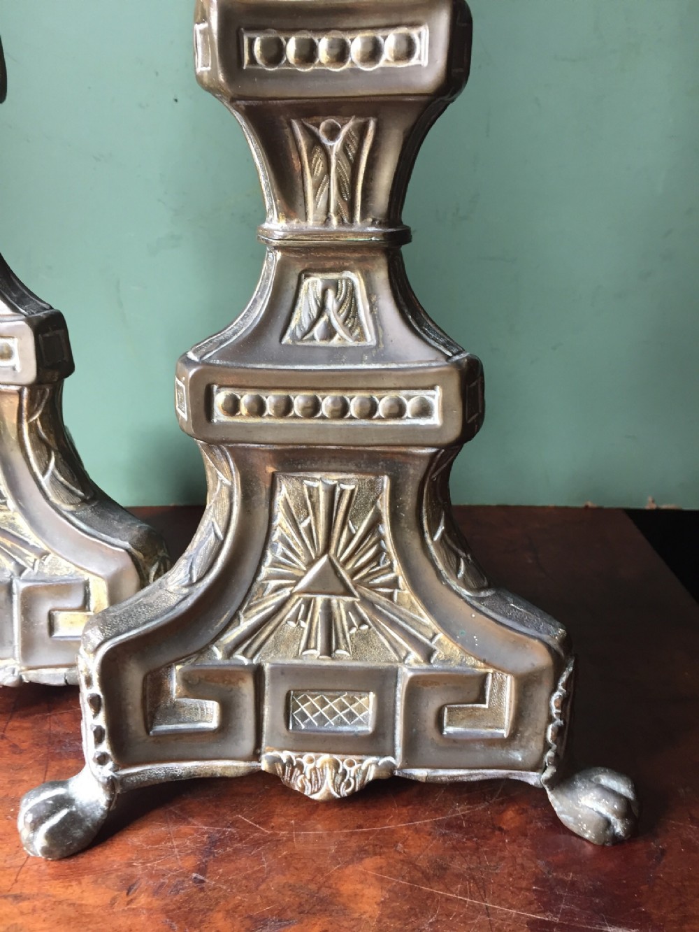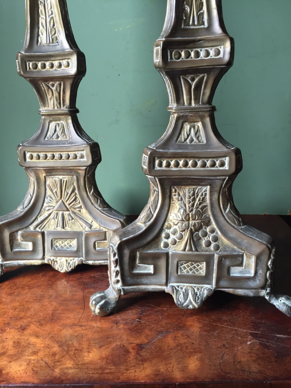 Pair of C19th French pressed brass pricket candlesticks. Decorative tall pair of tri-form pricket candlesticks of C17th design . Each side of triangular base with different pressed decoration . The wide circular drip-pans above a stylised Doric-capped leaf-embossed tapering body . Standing upon claw feet to the corners.