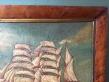 Evocative and well-executed sea-scape study of a 3-masted vessel upon an open sea. The billowing sails shown with detailed rigging lines and blocks. Painted upon a wooden board and mounted in its original burr-maple veneered rectangular frame with a gilt slip interior.