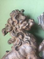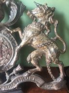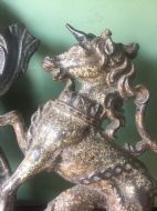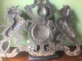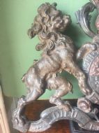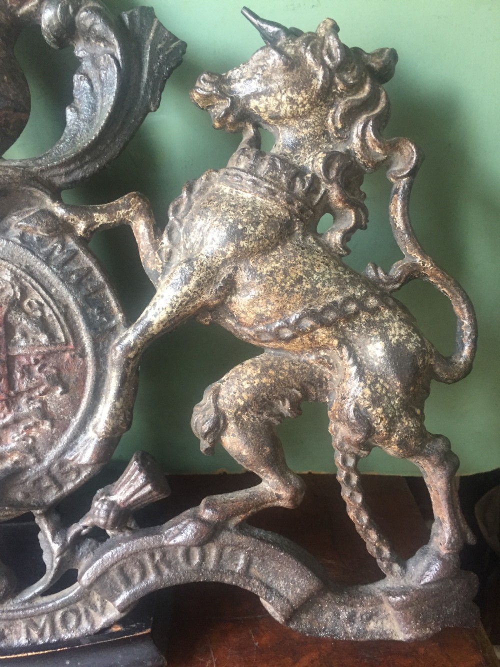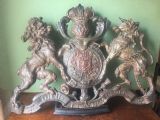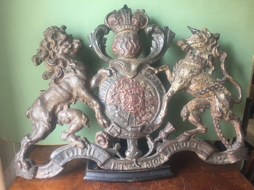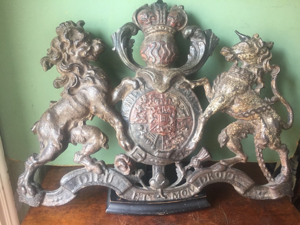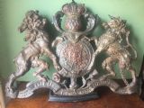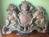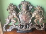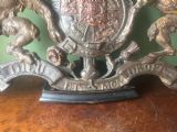 Well -cast Royal Coat of Arms with rampant lion and unicorn side supports bearing central crest . Bearing the tradition inscription and cypher of the British monarchy "Dieu et mon Droit" across the base.