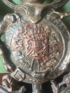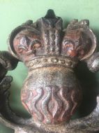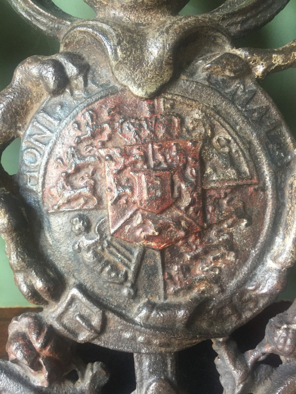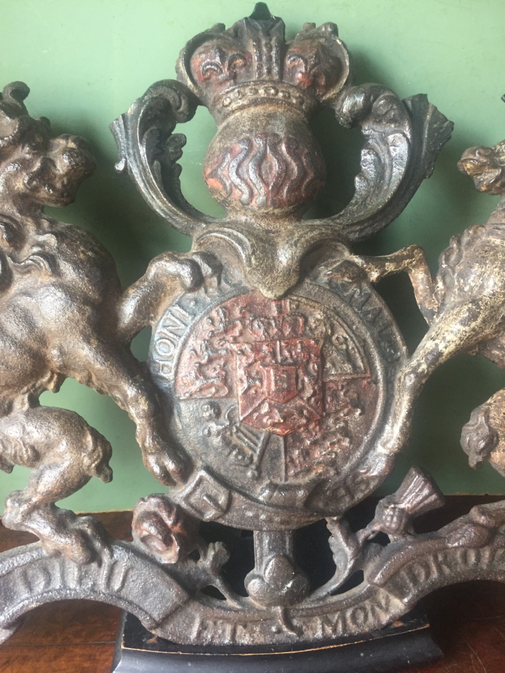 Mid C19th British cast-iron 'coat of arms' or Royal cypher with traces of original polychrome painted decoration.