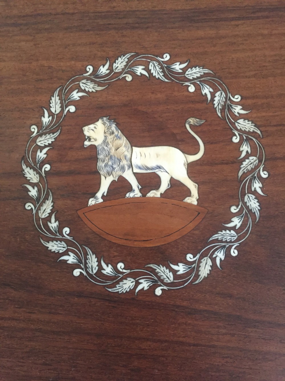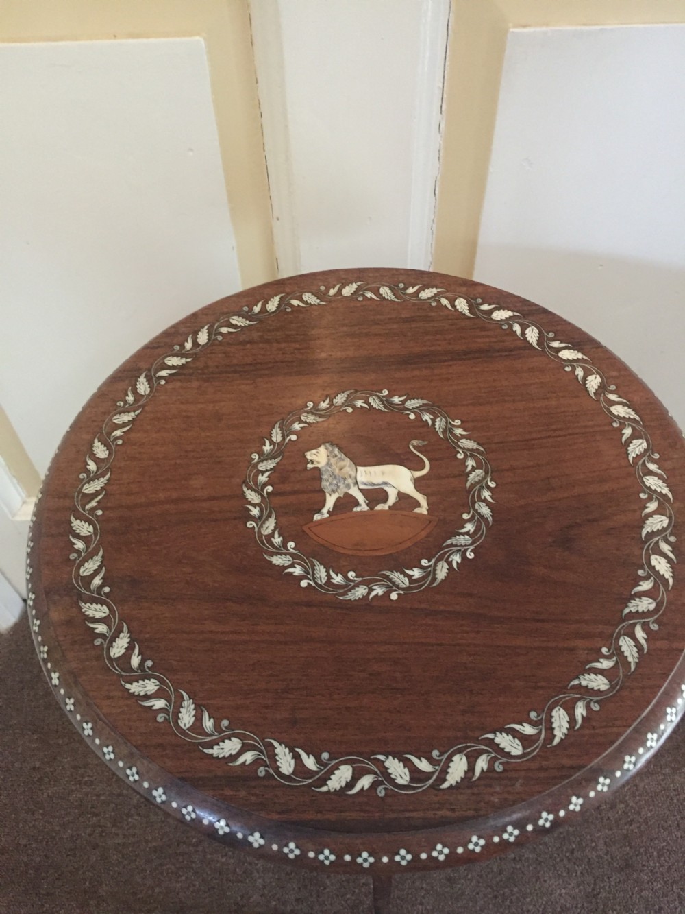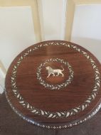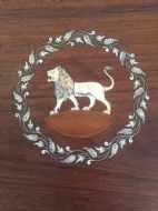 The circular top with finely-inlaid border of trailing floral design , the moulded edge with ivory flower-head inlay . The centre of the table top inlaid with a walking or prowling lion design , surrounded with a fine band of floral ivory inlay.