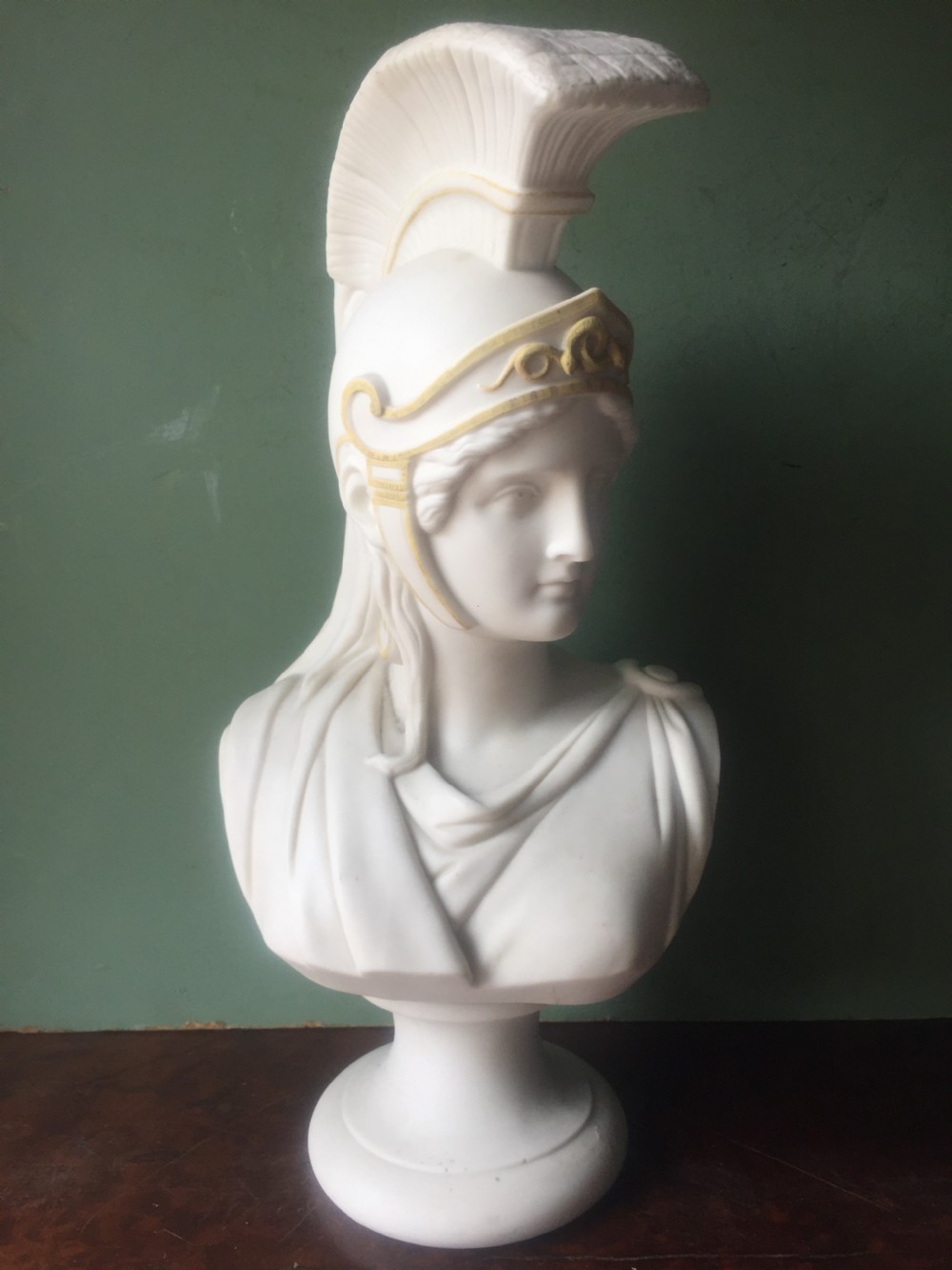 Well-modelled parian-ware white china bust study mounted on a circular socle base . The hero of the Trojan wars depicted wearing his distinctive plumed helmet . The helmet with gilded detail highlights, with coiled serpent design to the fore .