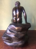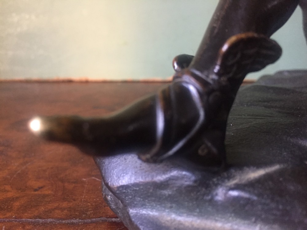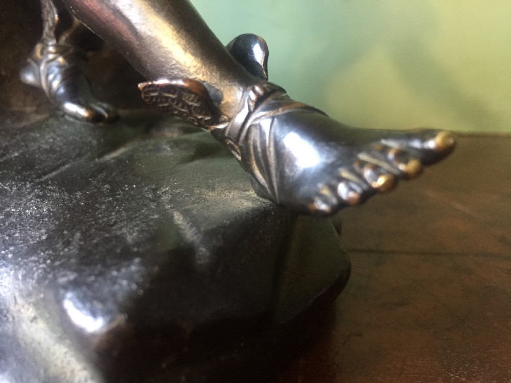 Bronze reduction of the iconic sculpture of Mercury or Hermes , messenger or herald to the gods depicted resting on a rocky outcrop. The god is shown entirely naked except for his winged sandals or talaria , a scrolled missive in his left hand .