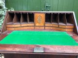 Bold mahogany bureau with a fall-front enclosing an elaborately-fitted serpentine shaped interior of inlaid satinwood and sycamore drawers , pigeonholes and central cupboard with an unusual lifting hinged central door . The fall interior fitted with a green baize writing or work surface .