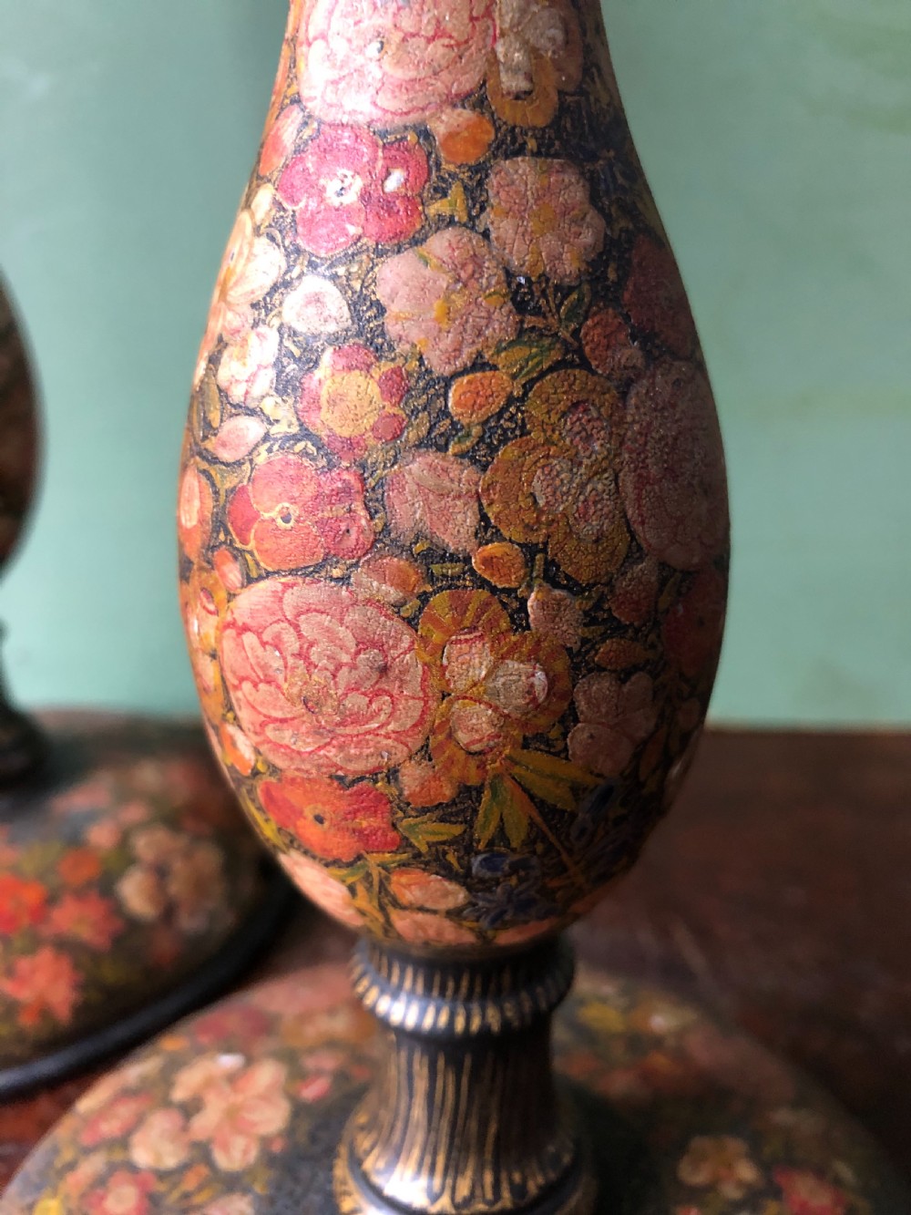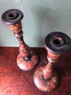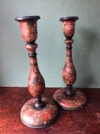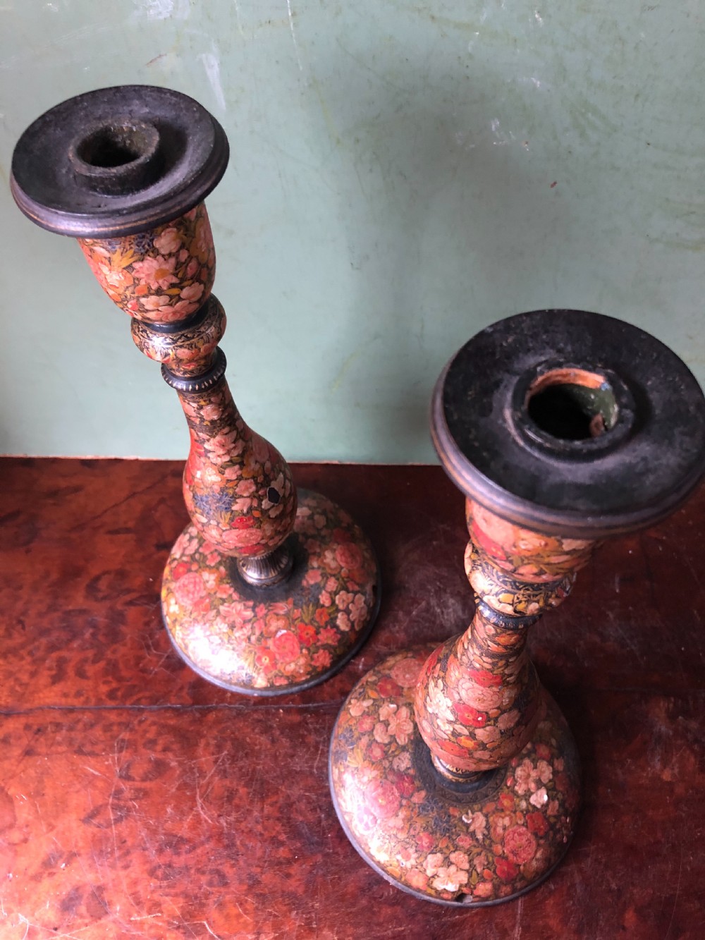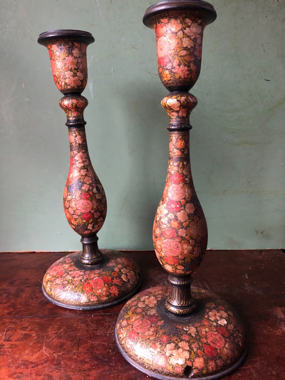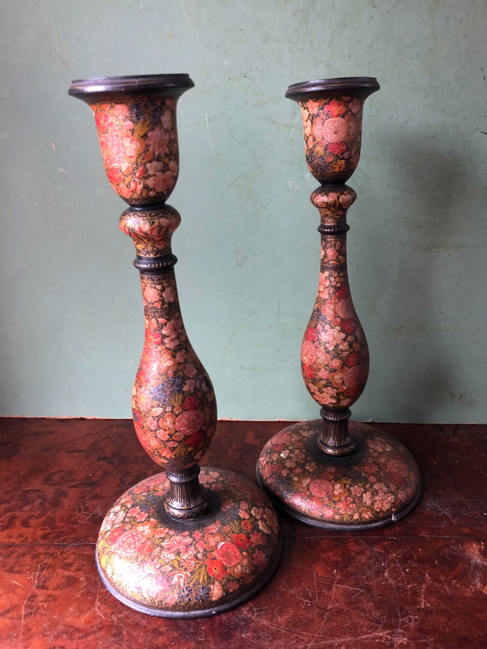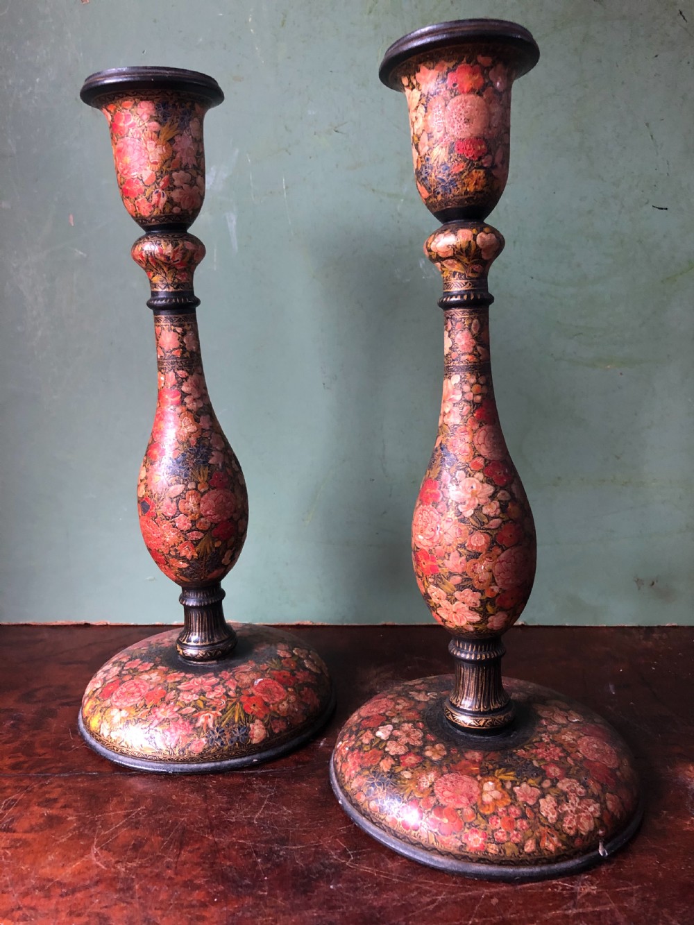 Pair of late C19th Kashmiri Indian papier-mâché candlesticks.