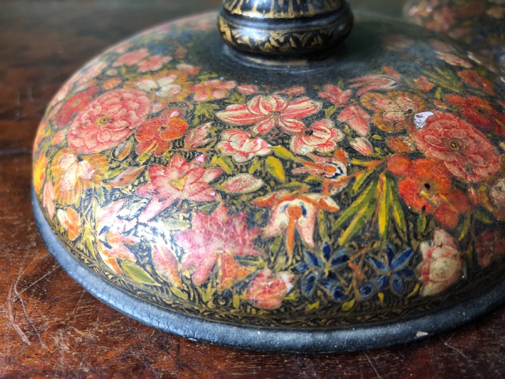 Typical regional multi flower-head and paisley design. Papier-mâché work of this type was traditionally produced at Srinagar in the Northern Indian region of Kashmir for export to the Western market. The technique was a handicraft brought to the region by Muslims from Persia in the C15th.