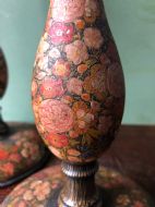 Highly decorative and colourful pair of Kashmiri region candlesticks which have been fitted as lamps at some stage . Turned candle nozzle tops and tapering swollen stems onto a spreading circular foot .