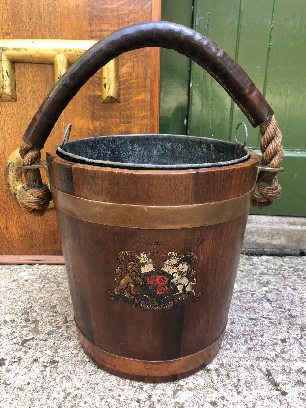 Interesting staved sectional teak Naval fire-bucket probably for sand , with a Royal cypher transfer and stitched leather-covered hemp rope-twist loop handle . The tapering body with 2 substantial coopered copper bands and substantial brass fittings for the handle secured in place by knotted ends .
