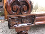 Raised on carved and turned legs all fitted with original brass cup castors and wheels. The carved and shaped figured rosewood upright end supports of stylised lotus-flower form with scrolls , above rectangular block tablet reserves of leaf carving . The horizontal seat frieze with a moulded and channeled profile . The whole of free-standing form , the reverse of the frame also having figured rosewood show-wood veneer.