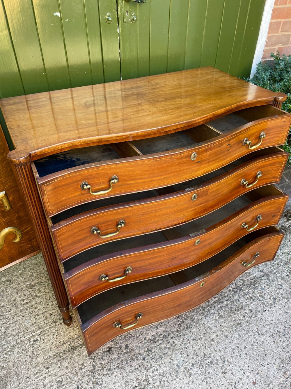 Shapely serpentine front chest of four graduated long drawers fitted with original brass ‘swan-neck’ handles , each with cross-banded edges with a boxwood line inlay and ‘cock-beading’ .The sides with reeded columnar upright supports and rounded top corners . The top drawer fitted with original divisions or partitions.