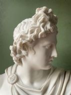 Crisply-modelled library or desk-top study of the god taken from the full-size life-size statue Greco-Romano sculpture known as the “Apollo Belvedere” , which is exhibited in the Belvedere courtyard of the Vatican museums, Rome , Italy .